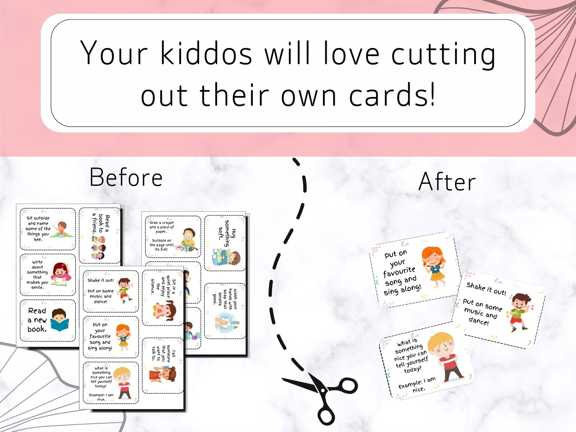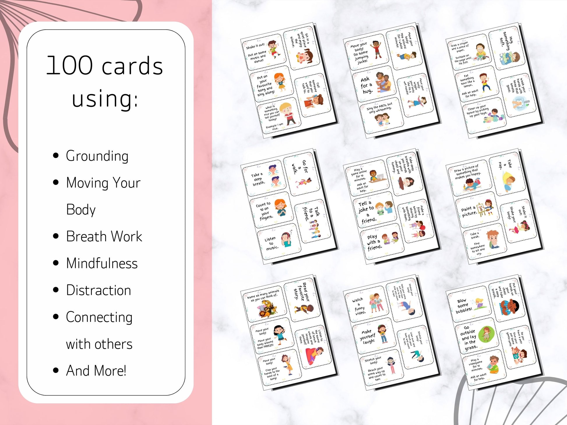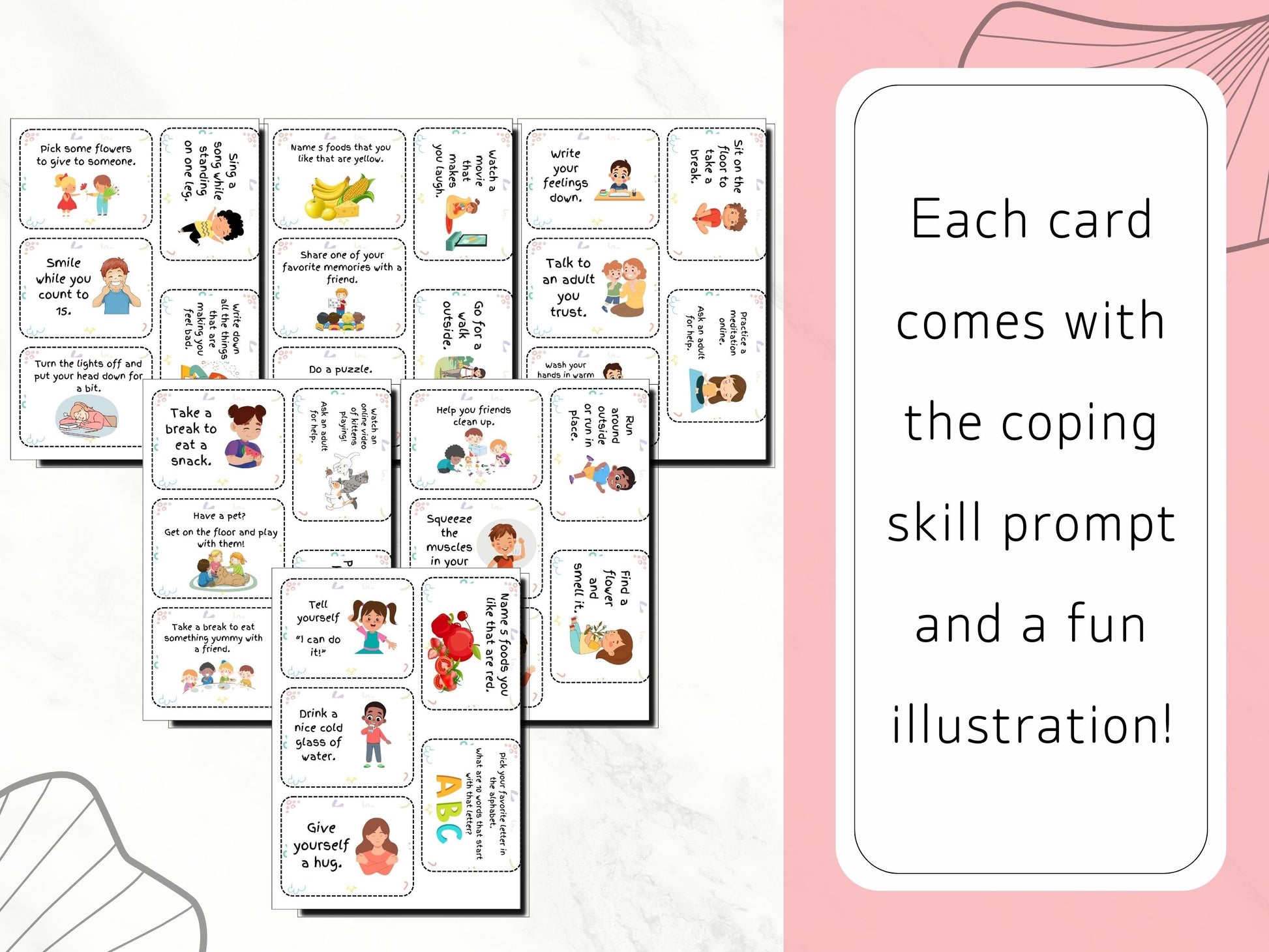 Each card has a coping skill and fun illustration on it, all to help your little ones learn how to feel their big emotions without causing harm to themselves or others.